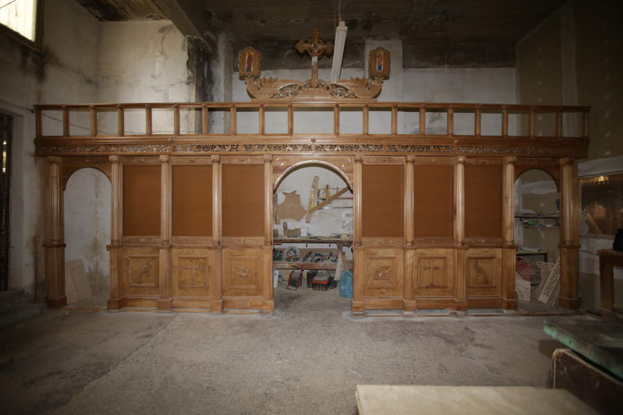 Ξυλόγλυπτο τέμπλο βυζαντινού ρυθμού με σκάλισμα από ξύλο φλαμούρι και συμήδας.